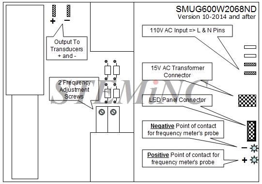 Use a frequency meter and connect its probes, minding the polarity (+/-), to the 12V DC contacts shown on the lower right corner of the drawing. Using its mini screws, tune the two blue pods until you have set the desired frequency. Now the generator should be turned OFF so the transducer can be connected to it.